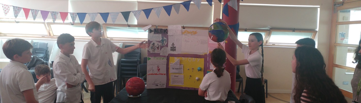 The talk was very inspiring, and the Year Sevens straight away started coming up with initial ideas for planets and story lines. With the arrival of sixth form helpers, as well as very kind support from Oxford University student Tamsin Morton, the groups started shaping their ideas into a coherent concept. Once their ideas were in place, they had large display boards, and model planets and moons to decorate! Chris Beckett circulated to see how their plans were developing, and answer any questions.